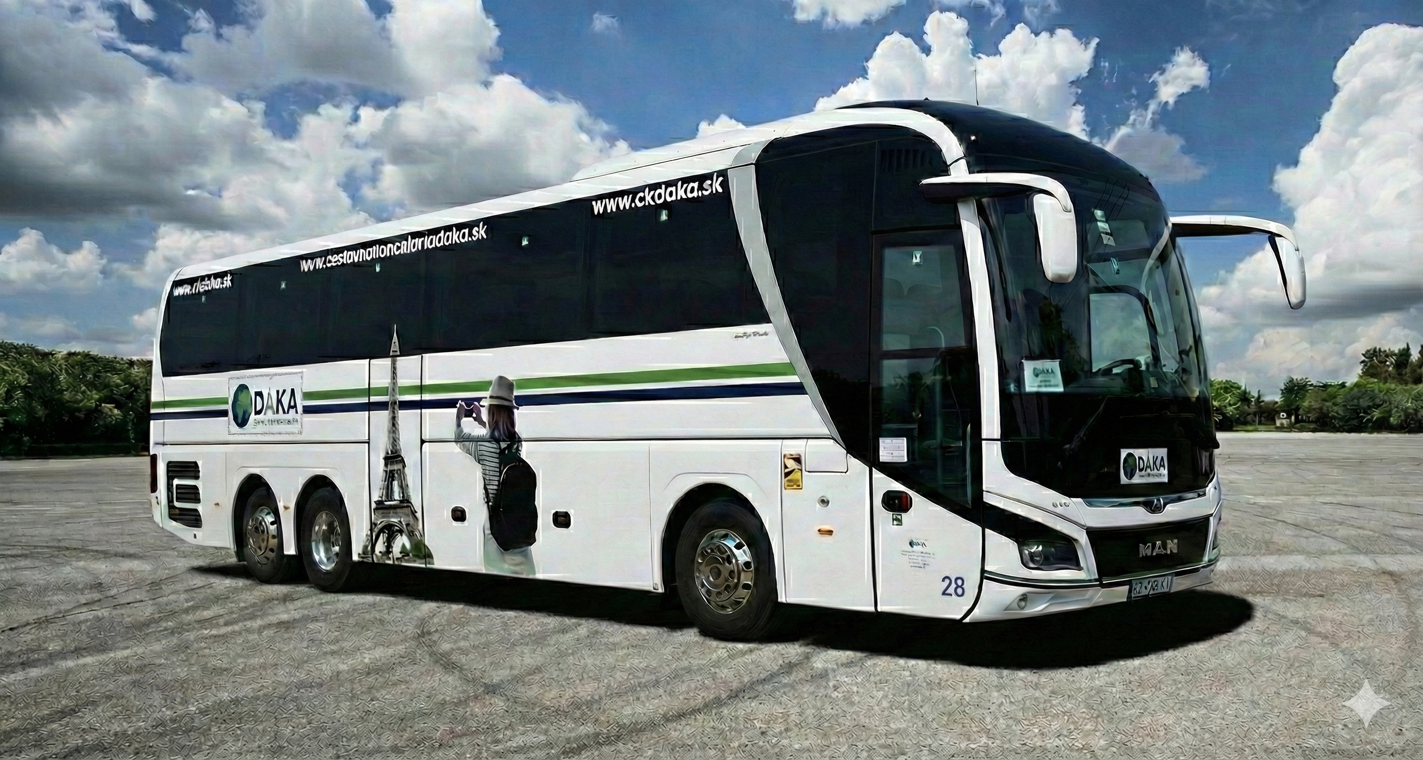 Luxusný 59 miestny moderný autobus značky MAN elegantnej bielej farby s pohodlnými polohovateľnými sedadlami vyrobený v roku 2025. Ako privítanie od nás dostanete welcome drink v autobuse v podobe praktickej fľaškovej minerálnej vody zadarmo.