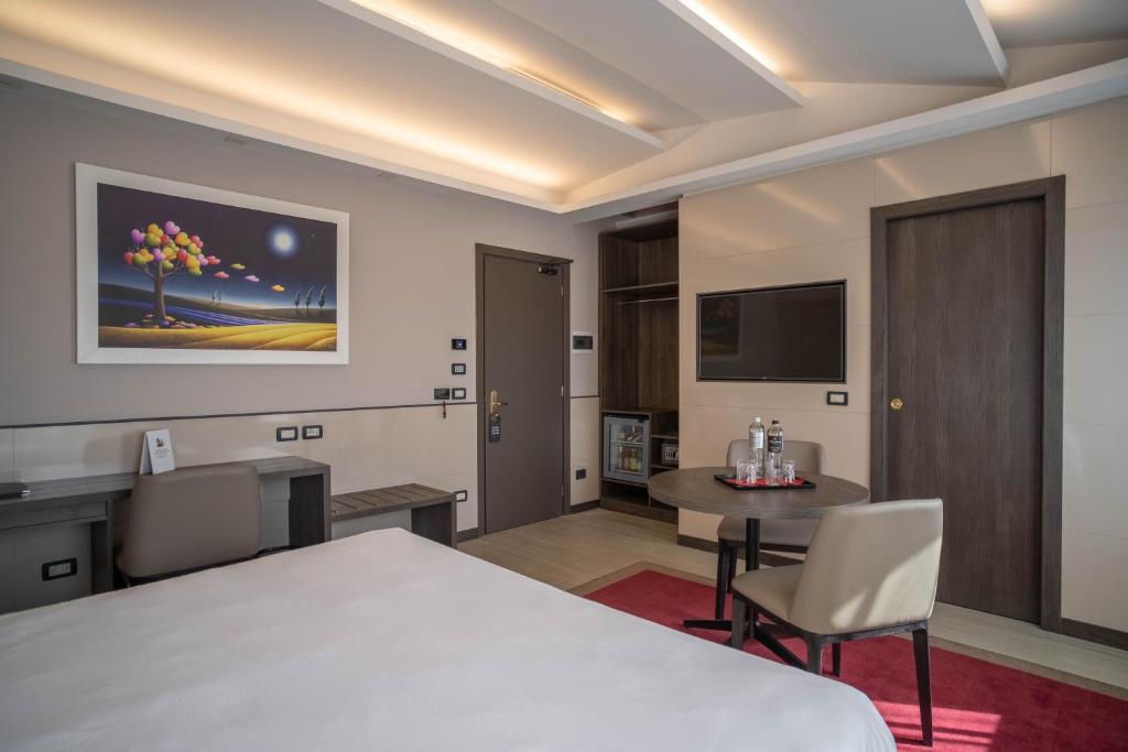 Hotel Guerro 4**** sa nachádza v malebnom mestečku Castelvetro di Modena, obklopenom vinicami a jemne zvlnenou krajinou, ktorá dýcha pokojom a talianskym šarmom. Tento elegantný štvorhviezdičkový hotel spája moderný komfort s tradíciou regiónu Emilia-Romagna, čím vytvára dokonalé miesto na oddych aj spoznávanie okolia. Už pri vstupe hostí víta útulná recepcia s priateľskou atmosférou. Interiér hotela je ladený v jemných farbách, ktoré navodzujú pocit harmónie a elegancie. Izby sú priestranné, svetlé a vkusne zariadené, s dôrazom na pohodlie a detail. Každá z nich ponúka klimatizáciu, bezplatné Wi-Fi pripojenie, minibar, TV s plochou obrazovkou a modernú kúpeľňu so sprchovacím kútom alebo vaňou. Niektoré izby majú aj balkón s výhľadom na okolitú zeleň či historické centrum Castelvetra, čo umocňuje romantickú atmosféru tohto miesta. Každé ráno sa hostia môžu tešiť na raňajky formou bufetu. Hotelová reštaurácia sa zameriava na tradičnú taliansku kuchyňu s dôrazom na kvalitu surovín. Okolie hotela láka na prechádzky historickým centrom Castelvetra, ktoré si zachovalo stredoveký charakter s úzkymi uličkami, kamennými domami a panoramatickým výhľadom na vinice. Len krátka cesta autom delí hostí od mesta Modena, presláveného výrobou športových áut Ferrari a typickej gastronómie. Hotel je čiastočne bezbariérový.