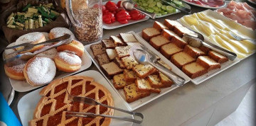 • raňajky v cene, ktoré zahŕňajú klasické kontinentálne studené raňajky, doplnené o šunku a syr. Podávané od 07:30 hod. 09:30 hod.