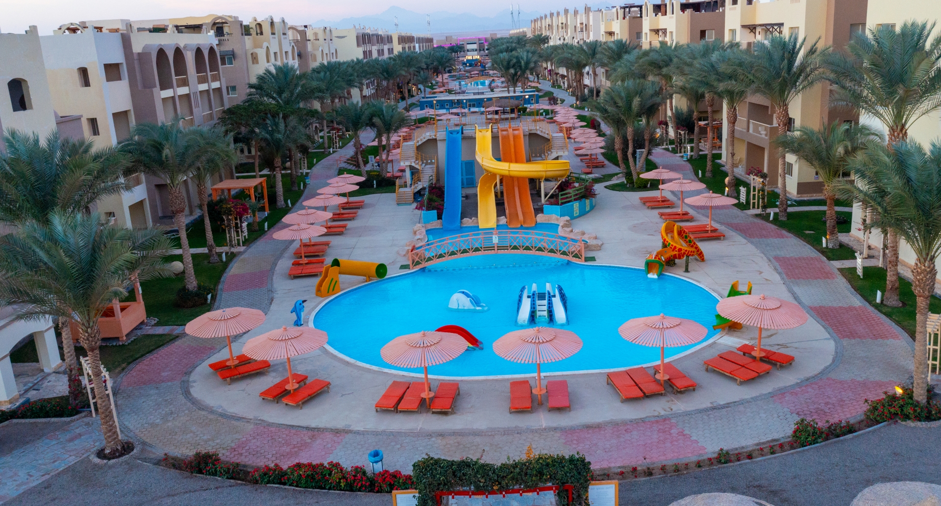 Rezort El Karma Aqua Beach Resort je moderný 4* rezort v severnej časti Hurghady, priamo pri súkromnej piesočnej pláži. Ponúka komfortné ubytovanie v apartmánoch s all inclusive stravovaním, bazénmi, barom a bohatým vybavením pre oddych i rodiny. V areáli nájdete všetko potrebné – od reštaurácií až po animačné programy. V areáli je dostupný aquapark s časťami pre menšie aj väčšie deti, takže sa zabaví dieťa každého veku. Za platbu na mieste je dostupný aj minilunapark s kolotočmi.