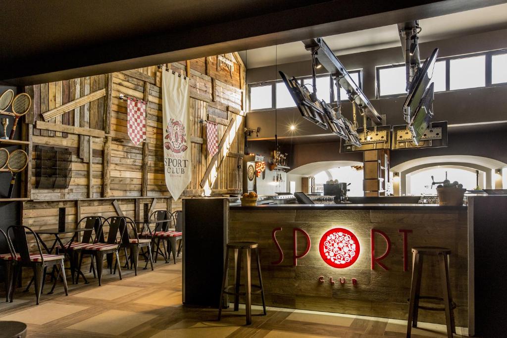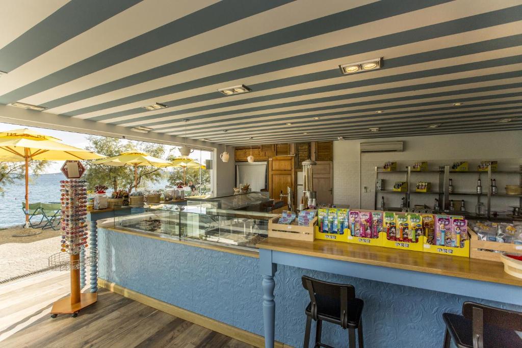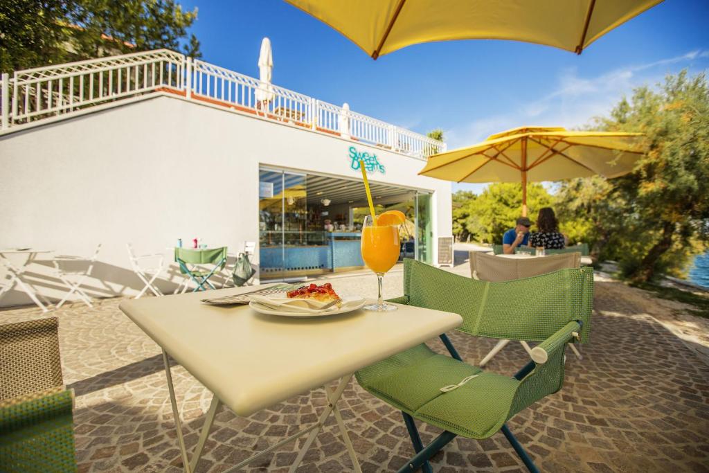 Na prvý pohľad rezort pôsobí ako premyslené miesto, ktoré kombinuje pokoj malého prímorského sídla s komfortom väčšieho dovolenkového strediska: chodníky vedú popod tienisté koruny stromov, terasy sú upravené tak, aby aj spodné rady apartmánov mali výhľad na záblesky mora, a atmosféra je pokojná, hoci stále ľudská. Recepcia rezortu je vstupnou bránou k pohodliu — personál sa stará o všetko potrebné od ubytovania, cez informácie o výletoch až po základné administratívne záležitosti. Priamo v areáli sa nachádza obchod, kde je možné zakúpiť bežné potravinové a hygienické potreby, malé stánky so suvenírmi dopĺňajú služby rezortu. Ak si prajete obed či večeru bez plánovania, reštaurácie a bistrá poskytujú široký výber jedál: od rýchlych plážových sendvičov a ľahkých šalátov, až po miestne dalmátske špeciality či taliansku kuchyňu — ideálne riešenie pre večery, keď sa nechce variť. Pre tých, ktorí si cenia pokojný relax pri vode, sú k dispozícii plážové bary a lehátka pri bazéne, takže popoludní sa dá pohodlne presunúť medzi morom a bazénom.