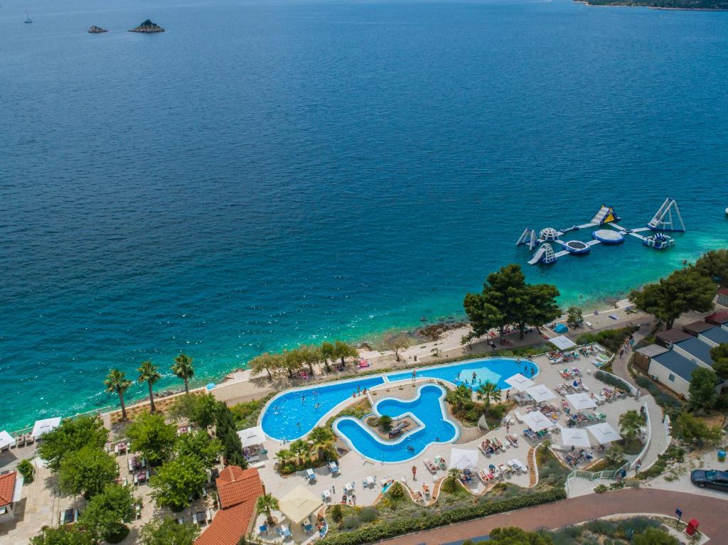 Apartmán 2+2 (cca 33 m²) je s jednou spálňou (2 lôžka), obývacou časťou s rozkladacím gaučom pre 2 deti do 12 rokov, kúpeľňa + sprcha/WC, terasa cca 10 m². Umiestnenie cca 50-100 m od pláže. Služby rezortu sa nezameriavajú len na ubytovanie — sú tu bazény (lehátka a slnečníky pri bazéne zadarmo), miesto na opaľovanie a prístup k moru s upravenými miestami na kúpanie. Pre rodiny s deťmi sú pripravené animačné programy a detský kútik, vďaka čomu rodičia dostanú priestor na relax alebo na športové aktivity. Ten, kto hľadá aktívnejší pohyb, môže využiť ponuku vodných športov, tenisové kurty alebo cyklotrasy v okolí; potápanie a výlety loďou sú populárne spôsoby, ako preskúmať azúrové vody a blízke ostrovy. Okolie rezortu je rovnako lákavé - len pár kilometrov leží historický Trogir so svojimi úzkymi kamennými uličkami, kaviarňami a pamiatkami, ktoré volajú na prechádzku v popoludňajších hodinách alebo na večerné spoznávanie kultúry a miestnej kuchyne. Pre tých, ktorí si udržujú rutinu aj na dovolenke, rezort spravidla zabezpečuje Wi-Fi v spoločných priestoroch a rôzne drobné služby, ako výmena plachiet, možnosti prania a dodatočné upratovanie na vyžiadanie. Ďalej sa v kempe nachádza bankomat, zmenáreň, požičovňa bicyklov a elektrobicyklov, bezpečnostné boxy, požičovňa áut.