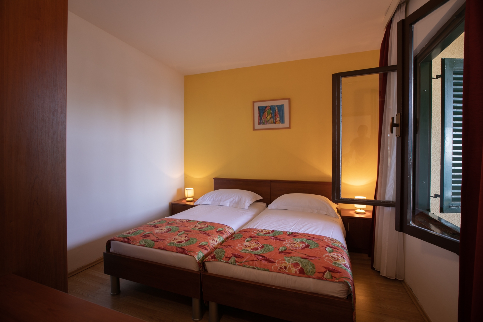 Apartmány sú koncipované pre pohodlnú rodinnú dovolenku. Interiér je praktický a funkčný — kuchynský kút vybavený základnými spotrebičmi - sporákom, chladničkou a často aj mikrovlnkou či kávovarom. Jedálenský kút navodzuje príjemnú rodinnú atmosféru, obývacia časť s rozkladacím gaučom slúži na oddych po výletoch a spálne sú zariadené tak, aby poskytovali súkromie a dobrý spánok. Klimatizácia zabezpečí príjemnú teplotu počas letných nocí, a terasa či balkón sú často predĺžením obytného priestoru — miesto na rannú kávu s morským pohľadom, alebo na večerné posedenie pri západe slnka. Kúpeľne sú vybavené sprchou a toaletou s praktickým priestorom na odloženie osobných vecí. V niektorých typoch apartmánov sú možné drobné variácie výbavy — napríklad niekde nájdete mikrovlnku alebo rýchlovarnú kanvicu, inde zase viac úložného priestoru alebo väčšiu terasu.