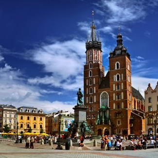Presun z Osvienčimu na hlavné námestie Krakowa, Rynek Glowny, ktoré je rozlohou najväčším stredovekým námestím strednej Európy. Je lemované peknými stredovekými domami bohatých mešťanov, ktoré vznikli najmä vďaka ťažbe soli v neďalekej Vieličke. Uprostred námestia sa nachádza renesančná budova Sukienice, ktorá plnila funkciu tržnice so súknom.