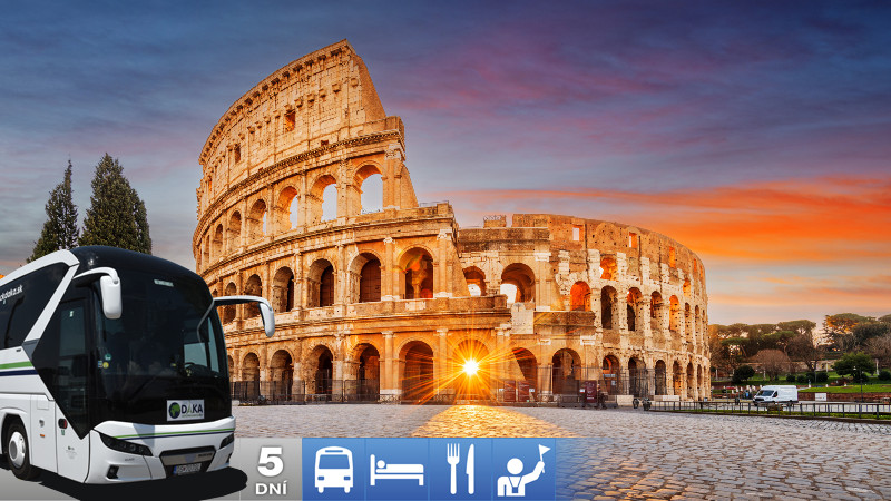 V ranných hodinách príchod do Ríma, prehliadka Circo Massimo, miesto, kde sa nachádzal kedysi obrovský hipodrom. Rimania milovali súťaženie v pretekoch na vozoch. Uvidíte Konštantínov oblúk, navštívite Koloseum, symbol Ríma, ktoré prežilo stáročia. Odohrávali sa tam gladiátorské zápasy, navštívite Palatín a Rímske fórum, kde sa nachádza napríklad chrám Vestáliek, ktoré chránili večný oheň a práve podľa legendy jedna z nich bola Rhea Sylvia, ktorej sa narodili dvaja bratia Romulus a Rémus a práve oni založili mesto Rím. Uvidíte Cisárske fóra, kde sa nachádza obrovská Trajánová tržnica, prejdeme cez Benátske námestie s palácmi, z ktorých sa prihováral ľudu Mussolini, odfotíte si pomník Viktora Emanuela II., ktorý bol prvým kráľom zjednoteného Talianska. Navštívime spoločne Kapitol, kde sa nachádza socha vlčice, ktorá vychovala Romula a Réma a práve vlk je národným symbolom Talianska. Prejdeme okolo divadla Marcello a to či hovoríte pravdu uvidíme v Bocca della Veritá, v ústach pravdy s návštevou kostola Santa Maria in Cosmedin, kde sa nachádzajú pozostatky Sv. Valentína, patróna zamilovaných. Prejdeme cez ostrov do štvrti Trastavere, kde budete mať čas na vynikajúcu zmrzlinu alebo návštevu kostola Santa Maria di Trastavere.